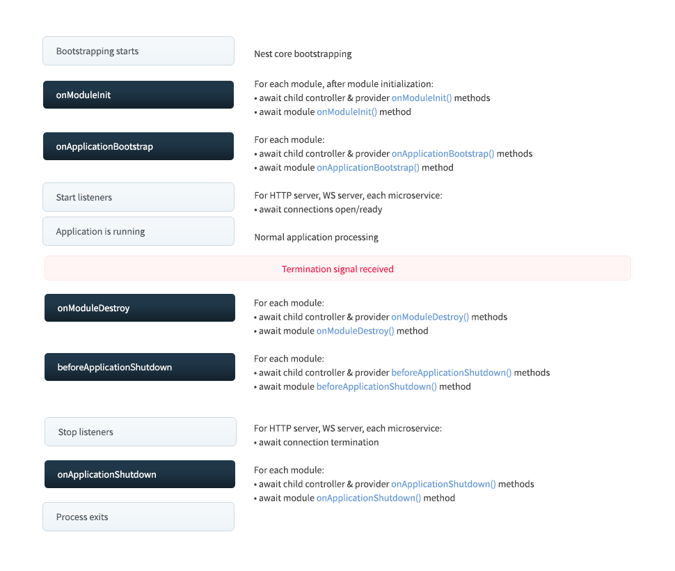 NestJS는 애플리케이션 시작과 종료 시 다양한 이벤트를 발생시킨다. 이를 통해 초기화 작업, 리소스 설정, 클린업(종료 작업) 등을 수행할 수 있다.